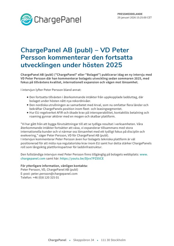ChargePanel AB (publ) ("ChargePanel" eller "Bolaget") publicerar idag en ny intervju med VD Peter Persson där han kommenterar bolagets utveckling sedan sommaren 2025, med fokus på tillväxtens kvalitet, internationell expansion och vägen mot lönsamhet.