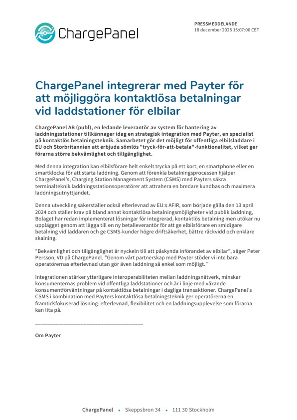 ChargePanel AB (publ), en ledande leverantör av system för hantering av laddningsstationer tillkännager idag en strategisk integration med Payter, en specialist på kontaktlös betalningsteknik. Samarbetet gör det möjligt för offentliga elbilsladdare i EU och Storbritannien att erbjuda sömlös "tryck-för-att-betala"-funktionalitet, vilket ger förarna större bekvämlighet och tillgänglighet.