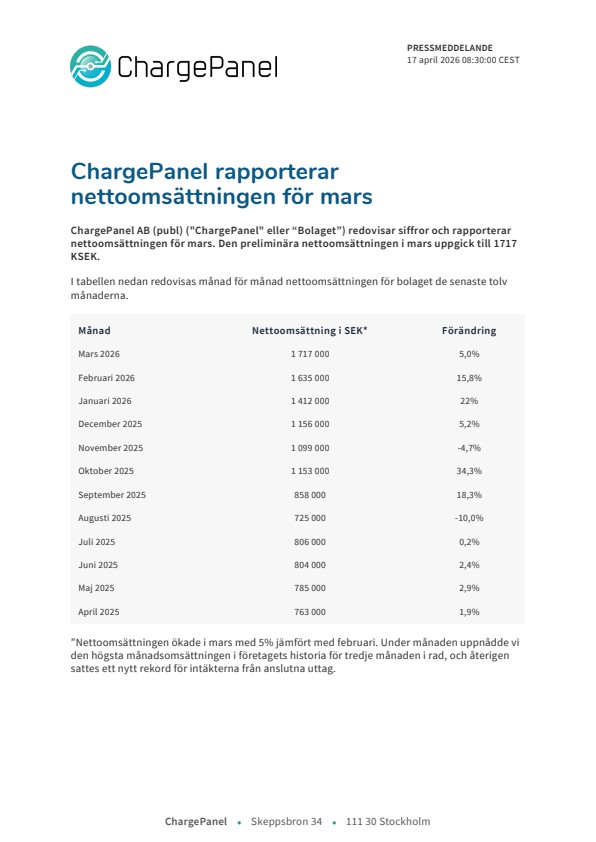ChargePanel AB (publ) ("ChargePanel" eller “Bolaget”) redovisar siffror och rapporterar nettoomsättningen för mars. Den preliminära nettoomsättningen i mars uppgick till 1717 KSEK.