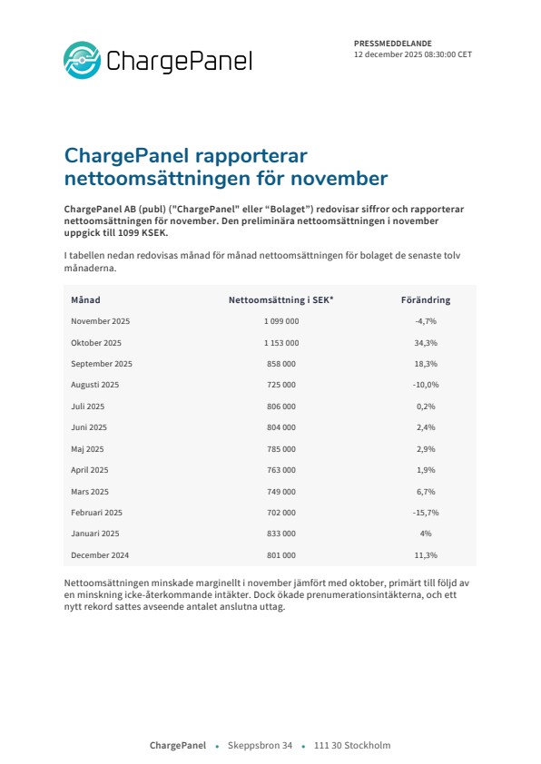 ChargePanel AB (publ) ("ChargePanel" eller “Bolaget”) redovisar siffror och rapporterar nettoomsättningen för november. Den preliminära nettoomsättningen i november uppgick till 1099 KSEK.
